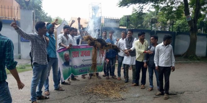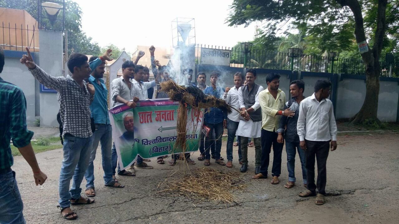 गया। छात्र जदयू के द्वारा मगध विश्वविद्यालय के कुलपति का पुतला दहन किया गया। मालूम हो कि कल मगध विश्वविद्यालय के प्रागण मे हो रहे सिनेट कि बैठक में शांतिपूर्ण तरीके से हाथ मे तिरंगा झंडा लिए निर्दोष आन्दोलन कारी पर कुलपति के इशारे पर जिस बेदर्दी से आन्दोलनकारी को मारा गया एंव तिरंगे की अपमान कि गई इसके खिलाफ छात्र जदयू ने मगध विश्वविद्यालय के कुलपति का पुतला दहन गया स्थिति कुलपति आवास के बाहर कि, छात्र जदयू ने मांग की है कि ऐसे छात्र विरोधी कुलपति को अविलंब हटाया जाए एंव तिरंगे के अपमान करने के आरोप में कुलपति को अविलंब गिरफ्तार किया जाए साथ ही साथ इनके साथ लिप्त पदाधिकारी को भी हटाया जाए,जब छात्र संगठन एंव काॅलेज के लोग अपनी मांग को लेकर शान्तिपूर्ण आन्दोलन कर रहे थे तो फिर क्या मजबुरी थी जो कुलपति के इशारे पर निर्दोष आन्दोलन को पिटा गया, ये कुलपति का गुंडागर्दी नही तो क्या ये बस अपनी गलती को और नकामी को छुपाने के लिए और भ्रष्टाचार को दबाने के लिए ही छात्रो पर लाठीचार्ज कराये, मै कुलाधिपति एंव माननीय मुख्यमंत्री से मांग करता हू कि ऐसे कुलपति जो छात्रो का सम्मान नही कर सकते है एंव तिरंगे का जो अपमान करते है उसे जल्द से जल्द हटाया जाए एंव तिरंगे के अपमान के लिए इन पर देशद्रोही का मुकदमा दर्ज किया जाये इस मौके पर प्रभात कुमार, करण वर्मा, मंगल कुमार, दिवाकर कुमार आदि मौजूद थे।